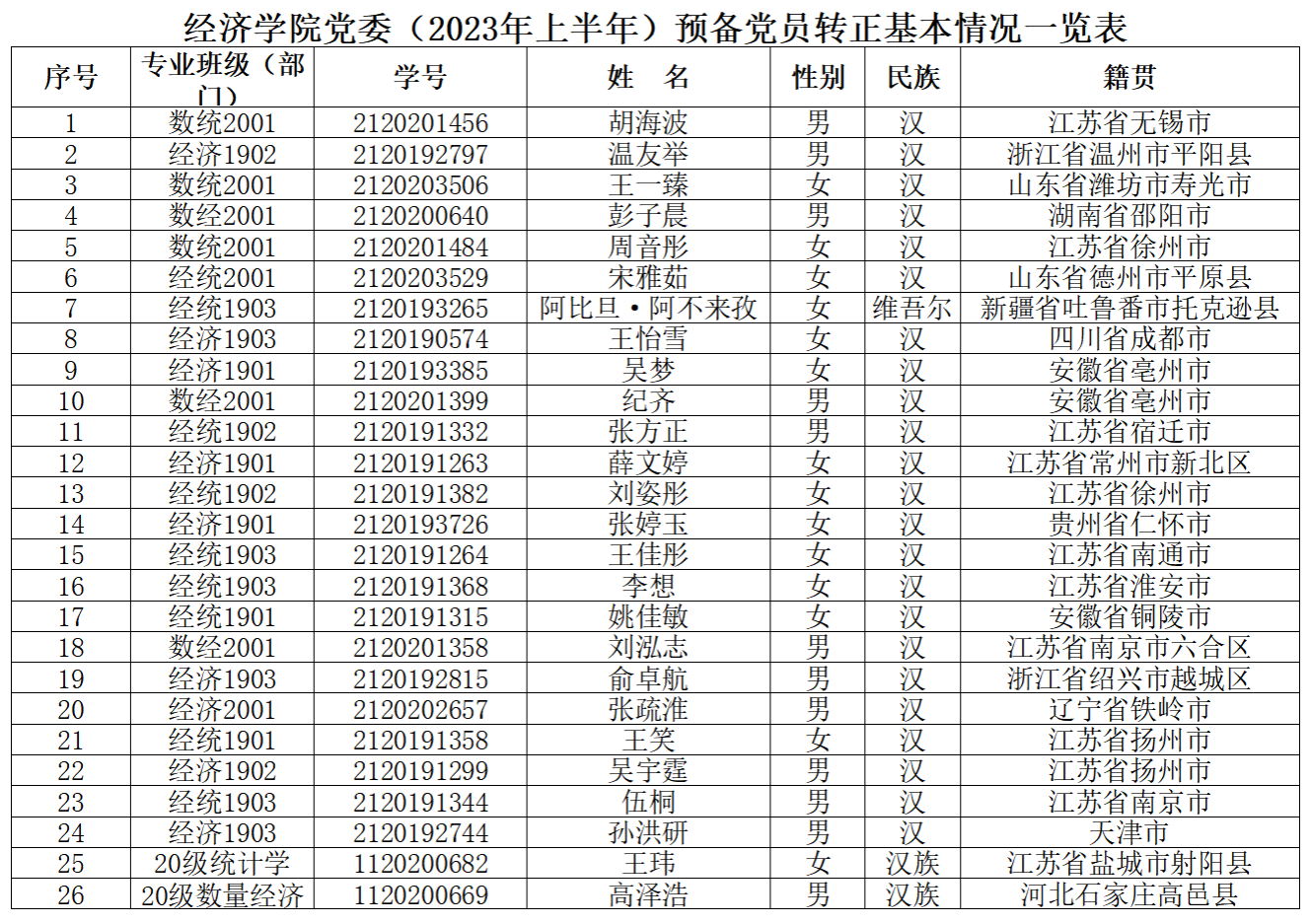 在听取党小组和党员、群众意见的基础上,经支部委员会审查同意,近期将召开支部大会,拟同意胡海波等26名同志转为中共正式党员。根据发展党员工作有关要求,现将其有关情况公示如下: