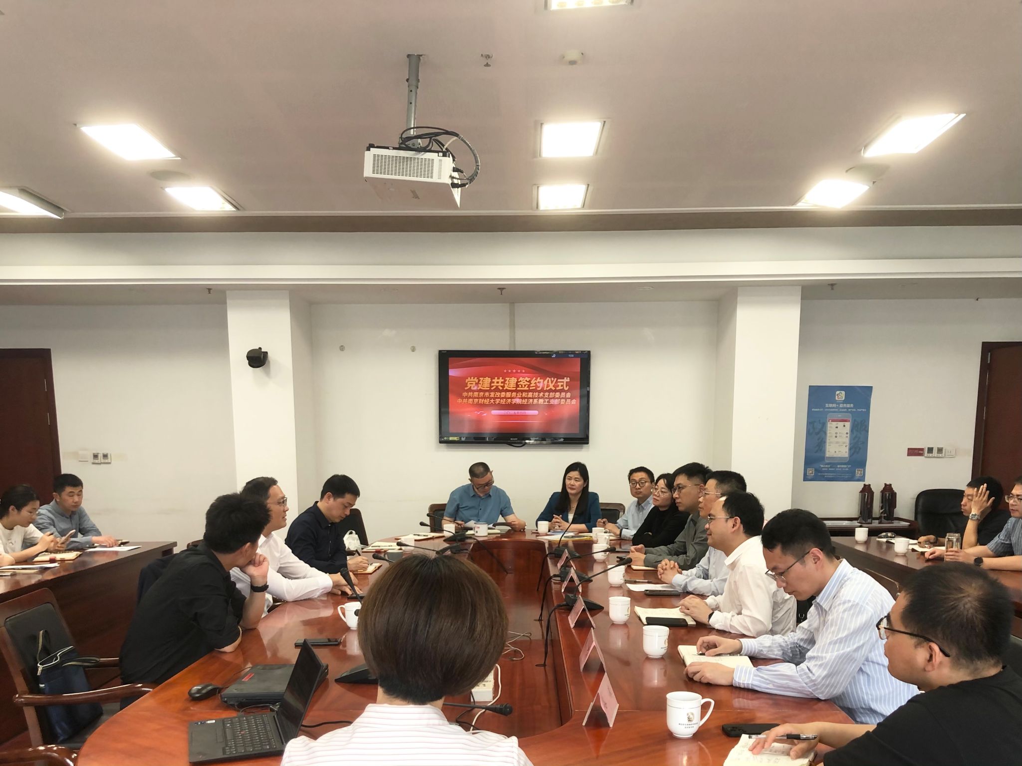 4月11日,南京财经大学西瓜直播足球 与南京市发展和改革委员会在新城大厦D座1869会议室联合举办党建共建活动暨政产学研对接交流会。南京市发改委党组成员、副主任贾尚斌,南京市发改委服务业和高技术发展支部书记、服务业务处处长胡耀,南京市发改委创新和高技术发展处处长赵勇,南京市发改委服务业和高技术发展支部相关人员参加会议,西瓜直播足球 党委书记张圣兵、副院长(主持工作)刘小峰等一行8人参加交流。