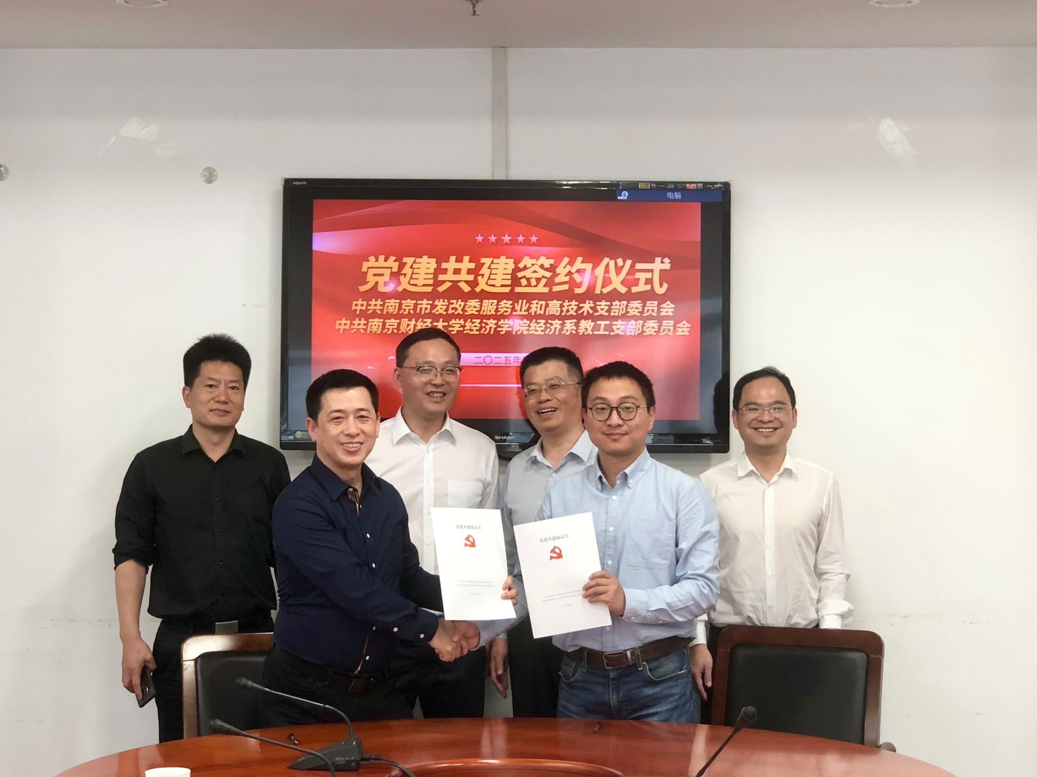 随后,中共南京市发改委服务业和高技术发展支部委员会书记胡耀与中共南京财经大学西瓜直播足球 经济系教工支部委员会书记杨泳冰代表双方签订了结对共建协议,明确未来将在“政治理论联学、组织生活联过、特色品牌联创、招生就业联拓”四大领域深化合作,实现党建与业务“双融双促”,贾尚斌副主任、张圣兵书记、刘小峰副院长等在场人员见证了这一时刻。