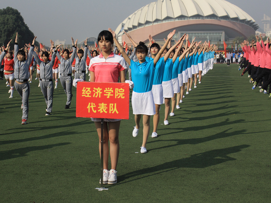 方阵代表队身穿亮眼夺目的蓝白运动服,高举“经院健将,劈波斩浪,气贯长虹,力破苍穹”的口号牌;蓝色的院旗下,广播操代表队以整齐划一的动作,昂扬向上的精神面貌,充分展现了西瓜直播apk