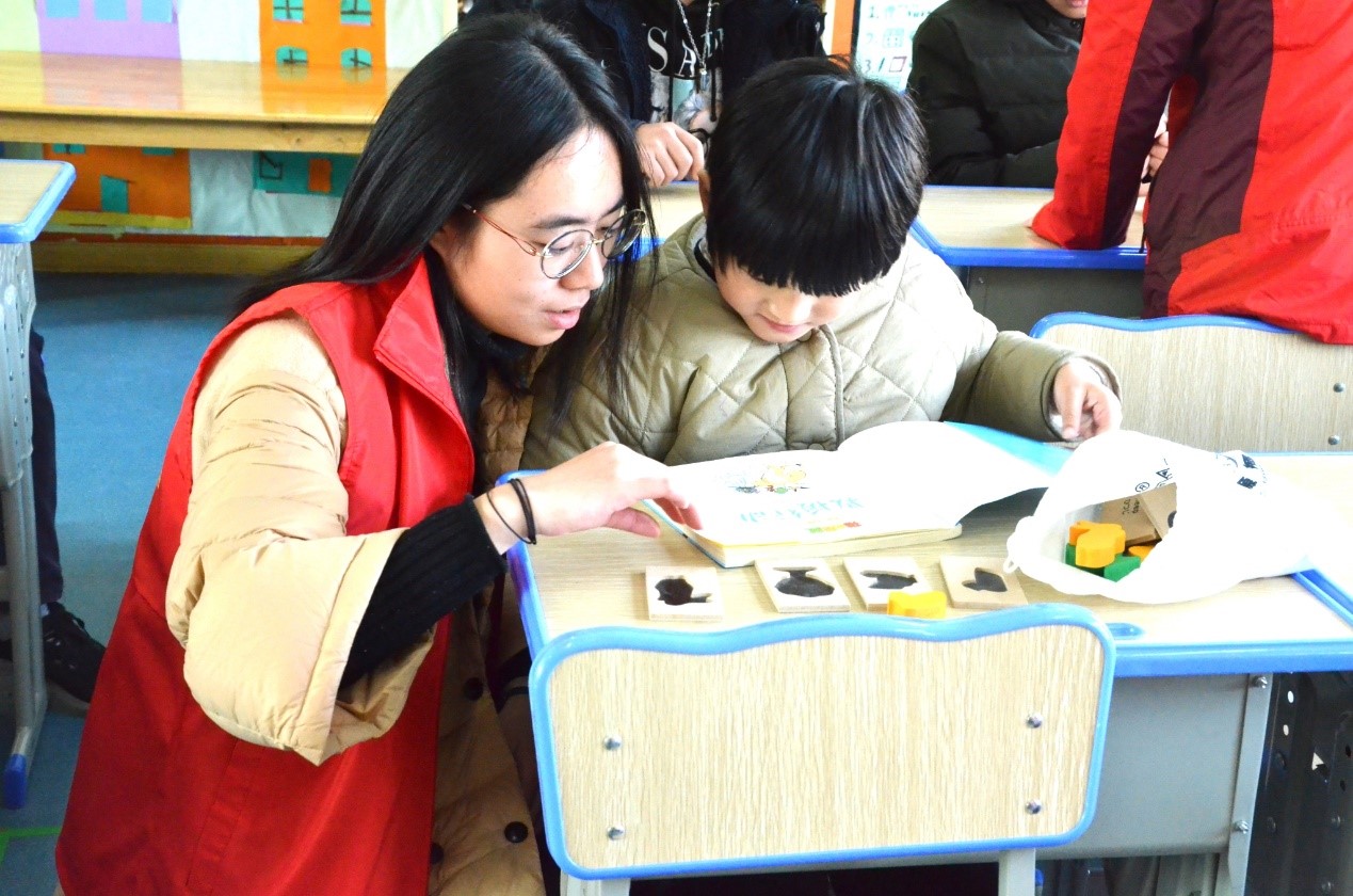 在康复中心,志愿者们参与一对一的活动课堂教学,有的志愿者负责教他们标准化的发音,有的则耐心教他们朗读古诗,有的教他们拼图或画画,有的和孩子们一起用彩泥创作。孩子们跟着志愿者们兴趣浓厚地学着,在志愿者们耐心与鼓励下,都竭尽全力做到最好。