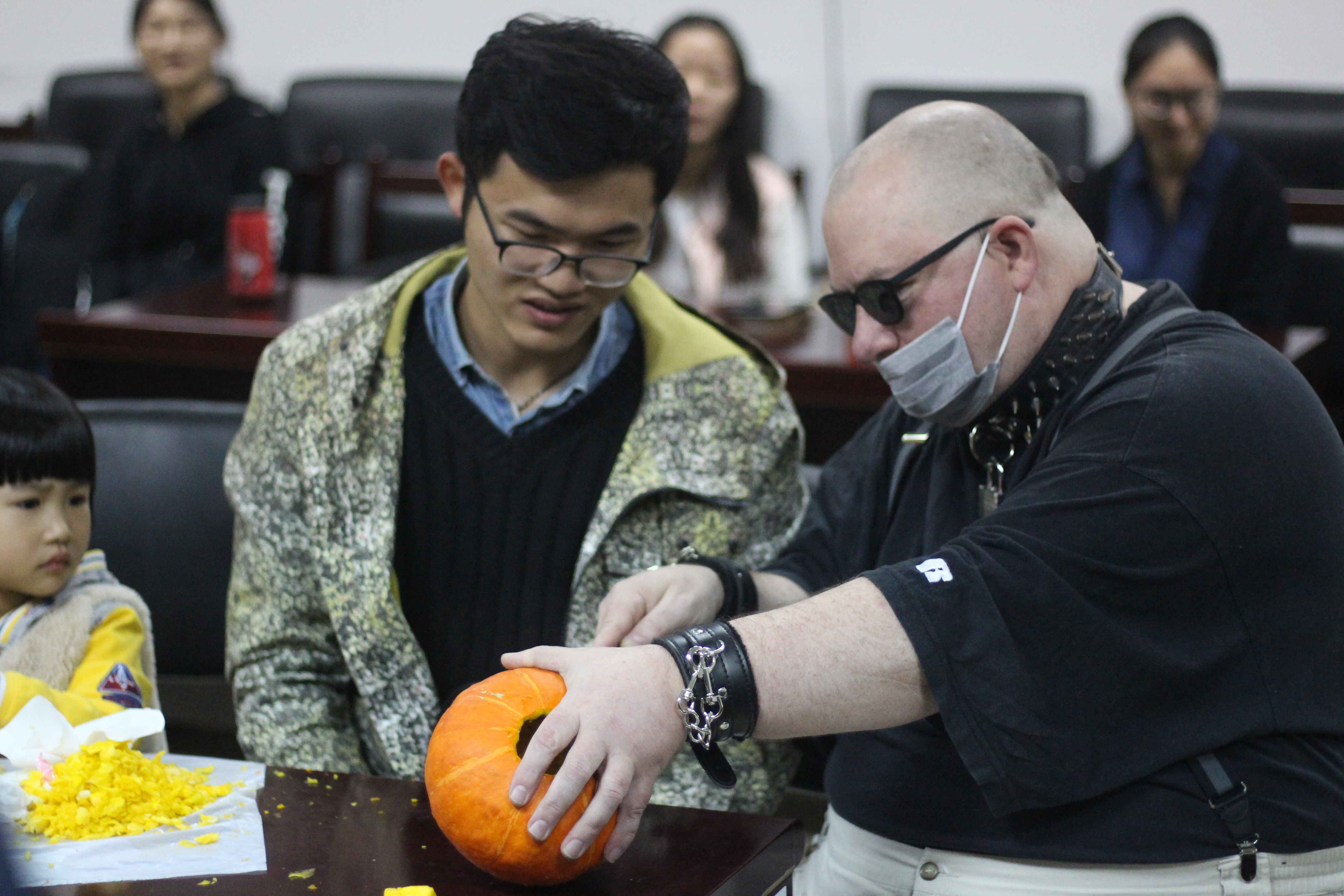 当晚,师生们带着面具、涂着油彩,用英语快乐地交流着。外教Jeffrey Smith正在教同学们制作南瓜灯。他首先讲解了南瓜灯的制作:先把南瓜顶部切开,再将内部掏空,然后在南瓜外层刻出鬼脸的表情,三角形的眼睛和鼻子,咧开的嘴,十分搞怪。最后在南瓜内部放上蜡烛,盖上南瓜帽,就完成啦。虽然说的容易,但南瓜灯的制作却着实是个力气活。同学们根据Jeffery的描述,并发挥自己的创造力,完成了一个个可爱搞怪的南瓜灯。“我们做好了!”一组同学兴奋的叫喊着。Jeffrey赶紧小跑到那边,双手捧起南瓜灯,兴奋大赞“Perfect!”。随后其他几组也相继完成,尽管有的南瓜灯歪了嘴,有的眼睛大小不一,但同学们都为自己的作品而感到自豪。周绍东老师也在现场指导和督促同学们制作,和同学们玩成一片。