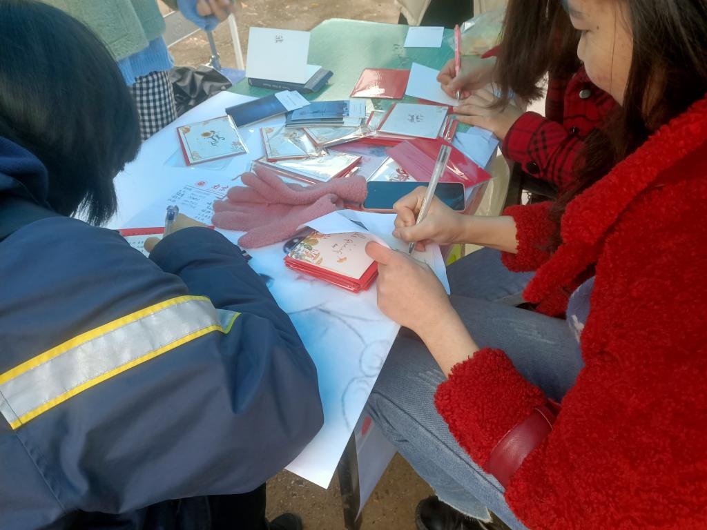 外场活动中,同学们拿着免费提供的贺卡、明信片,将一汪思念凝聚在笔尖,千言万语落墨到一方白纸上,学生会的同学将同学们的心意以邮寄的形式送到各位感恩接收者手上。