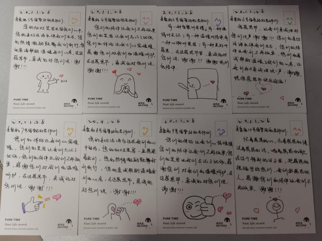 的辅导员老师,表达同学们对老师传授知识的感谢,让老师们切实感受到同学们的对老师辛勤付出诲人不倦的感激之情。同学们向宿管阿姨、保安叔叔和食堂工作人员赠送祝福贺卡,表达同学们对他们工作的认可以及感谢,感谢他们的兢兢业业,在自己的岗位上默默付出,甘于奉献。