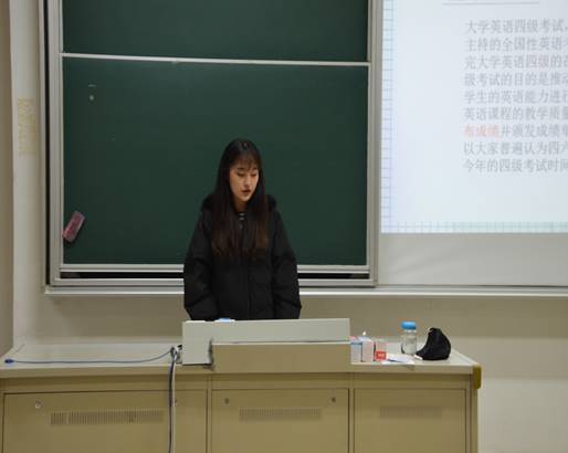 本次活动共分为两个部分。第一个部分是大学英语四级考试经验分享环节。经济1803班的戴紫霜同学为大家分享大学英语四级考试经验技巧。戴紫霜同学在过去一年里,以646分通过大学英语四级考试、以645分通过大学英语六级考试。她主要从三个方面进行分享:一、遵守考试规则,备齐考试用品。由于大学英语四级考试是国家级别的考试,因此19级大一新生一定要遵守考试规则。如带好学生证、身份证和准考证,三证齐全才能参加考试,另外,迟到的考生不能参加考试,因此要提前5-10分钟进考场。同时,考生一定听从考试指令。此外还要备齐考试用品,如考试需要填涂机读卡,因此要准备好2B铅笔等文具,听力考试需要使用收音机,要准备好电池和耳机,另外鉴于移动通讯工具不能带入考场,考试期间需要查看时间的同学请准备好手表等。二、戴紫霜同学为大家展示大学英语四级的考试题型和流程,并将自己在参加考试时对各种题型的时间分配介绍给大家,帮助同学们强化把控考试时间的能力。三、戴紫霜同学还贴心地为同学们传授自己在大学英语四级考试答题时的一些技巧,如听力部分在不能完全听懂的情况下尽量选择听到的句子,阅读理解部分可以从原文中寻找答案,翻译部分尽量用简洁的语句完整地诠释原句语意等,她最后鼓励同学们好好复习迎考。