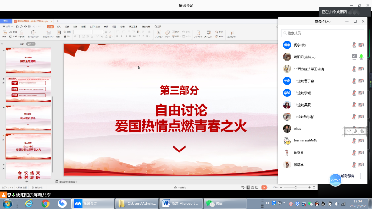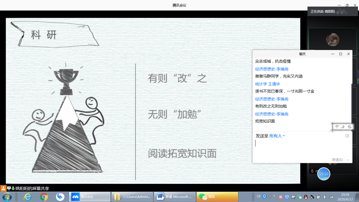 本次主题教育以微视频+自由讨论的形式开展,活动过程中,主持人依次播放三位同学事先录制的微视频。经济思想史专业19级研究生顾靖宇就抗疫知识科普与同学们进行分享,他从新冠肺炎的临床表现、密切接触者隔离以及如何预防新冠肺炎等方面展开了健康知识科普。西方经济学专业19级研究生马群就新冠疫情对我国经济产生的影响以及政府的积极应对措施发表了自己的观点,他认为,这次疫情虽然对旅游业、零售业和餐饮业等产业造成冲击,但也为医疗卫生、线上服务等行业带来机遇,各级政府的应对措施更是大力推动了企业复工复产。人口、资源与环境经济学专业19级王庆玲分享了个人宅家高效学习经验,她表示在扎实学好必修课程的基础上还要加强科研与课外拓展,同时培养锻炼与阅读等良好习惯,在各方面贯彻“停课不停学”的原则。
