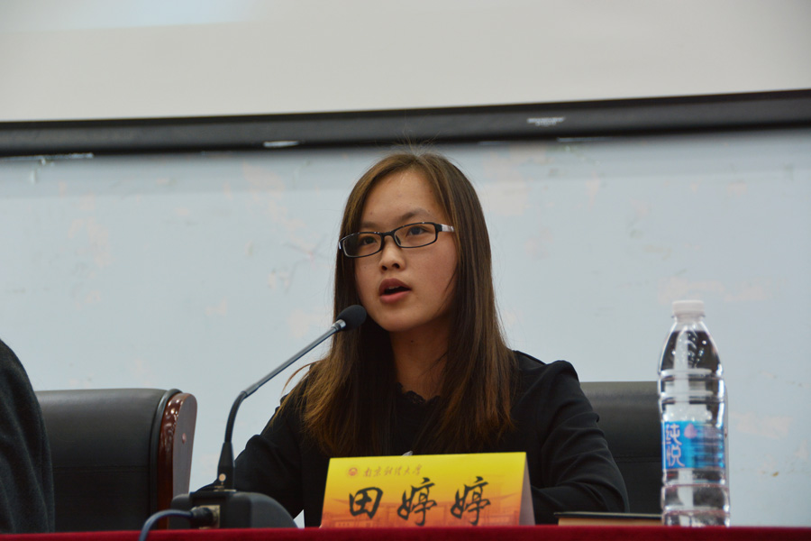 学生会主席、国家奖学金获得者宫铭,她主要向同学们分享了大学竞赛、社团活动和学习上的一些经验:大学竞赛首先要有兴趣、有意义,找到志同道合的伙伴,以及多参加校外竞赛;在社团与学习方面,要合理协调时间,确立目标和计划,与优秀的同学为伍等。