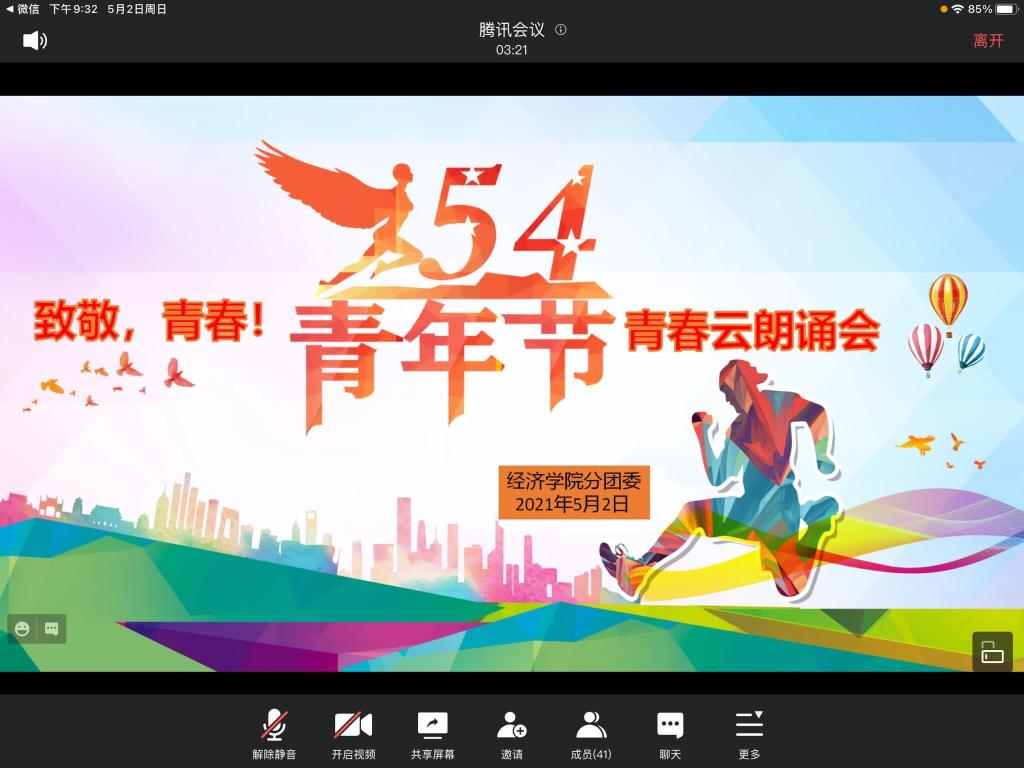 活动伊始,参与人员准时进入腾讯会议。首先,由团委副书记介绍五四青年节的历史由来,讲述五四精神,以及当今时代五四精神的伟大传承。从1919年的青年爱国运动,到2021年的青年人成为社会主义建设的生力军,无数青年人在中华民族伟大复兴之路上奉献出了自己的青春,这正是当代大学生应该学习并深刻感悟的时代精神。参与人员听罢这一席话,纷纷感叹中华民族一路走来的艰辛,正是无数志士仁人的抛头颅洒热血,才成就了如今腾飞的东方巨龙。