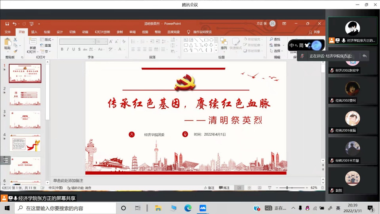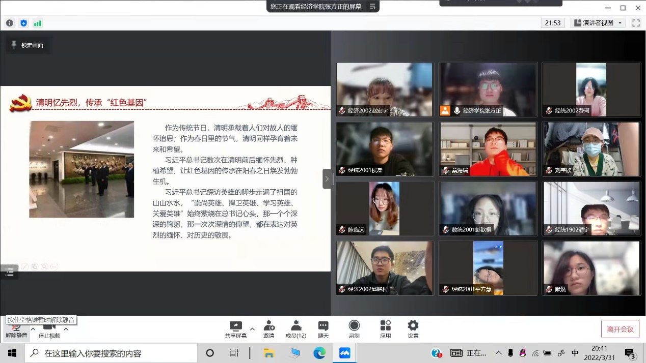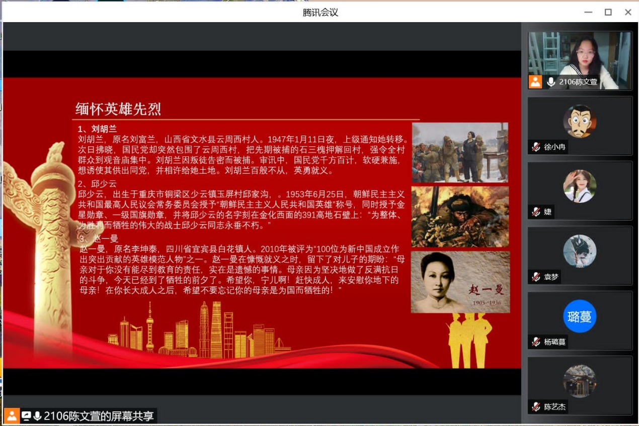 分团委组织各班以线上团课的形式开展丰富多样的清明祭英烈活动,各团支部通过ppt、视频等形式带领同学们回顾了百年来代代革命先烈赴汤蹈火、矢志不移,用鲜血和生命书写的气吞山河的英雄史诗。经济2106班团支部以侵华日军南京大屠杀遇难同胞纪念馆为背景展开了对南京历史的追忆,着重介绍了南京大屠杀中为保卫民族英勇斗争的抗日英雄,他们的英烈壮举让许多同学内心动容、眼眶湿润;经济1902班团支书向同学们介绍了在疫情阴霾笼罩下,在疫情战斗的前沿阵地,与病毒抢跑、与死神抢人、勇敢逆行的医护工作者们;数统2001班团支书向同学们介绍了清明节的重要内涵,他说道:“通过此次团课,我认识到清明节不仅是人们祭奠先祖、缅怀先人的节日,也是中华民族认祖归宗的纽带,更是一个远足踏青、亲近自然、催护新生的春季仪式。”团课期间,同学们都神情庄重严肃,认真聆听团支书的介绍与分享,积极参与讨论互动,并在线上为英雄先烈们留言,寄托哀思。同学们纷纷表示此次清明祭英烈活动,让他们走进历史,走近英雄先烈们,明白了现在生活的来之不易,更懂得了作为新时代青年所肩负的历史责任和使命担当。