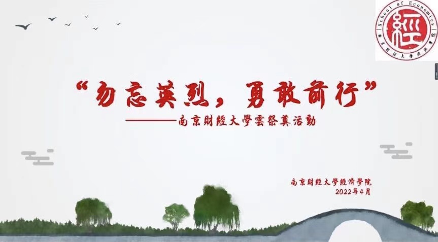 学生会举办了清明“云祭奠”活动,缅怀为了民族独立和人民解放抛头颅、洒热血的革命英烈,创作出了很多以“勿忘英烈,勇敢前行”为主题的文章、摄影和诗歌作品。经济2105班曹光璇同学联想晏殊《破阵子·春景》中的“燕子来时新社,梨花落后清明”,提笔写下文章《承英烈之远志,扬中华之旌旗》,以此祭奠先烈,希望他们被永远铭记,永远活在这草长莺飞的春日里。经济2101班乔昱同学则在她的诗歌作品《你听》中刻画了一群枪林弹雨中的英雄和一位像陈陆烈士一样为解救被困洪水中的群众而牺牲的战士,希望青年传承不怕牺牲、勿忘英魂的精神,勇敢前行。笔名为雁栖的同学展示了其创作的诗歌《碧血丹心,忠贞不渝》,诗中描写了过去的辉煌、近代的衰败以及一代代先烈们筚路蓝缕的奋斗史,寄语中华民族伟大复兴和对未来的展望。经济2101班张欣雨同学以文章《年年祭扫先人墓,处处犹如长春风》来纪念为新中国献出宝贵生命的英烈们。经济2101班俞妍同学展示了在参观侵华日军南京大屠杀遇难同胞纪念馆时所拍摄的照片,警示人们铭记历史,砥砺前行。同学们纷纷表示要牢记革命先烈的伟大功绩,继续发扬革命先辈的优良传统,传承红色基因,将思念写在山河大地,勇立时代潮头,争做时代先锋。