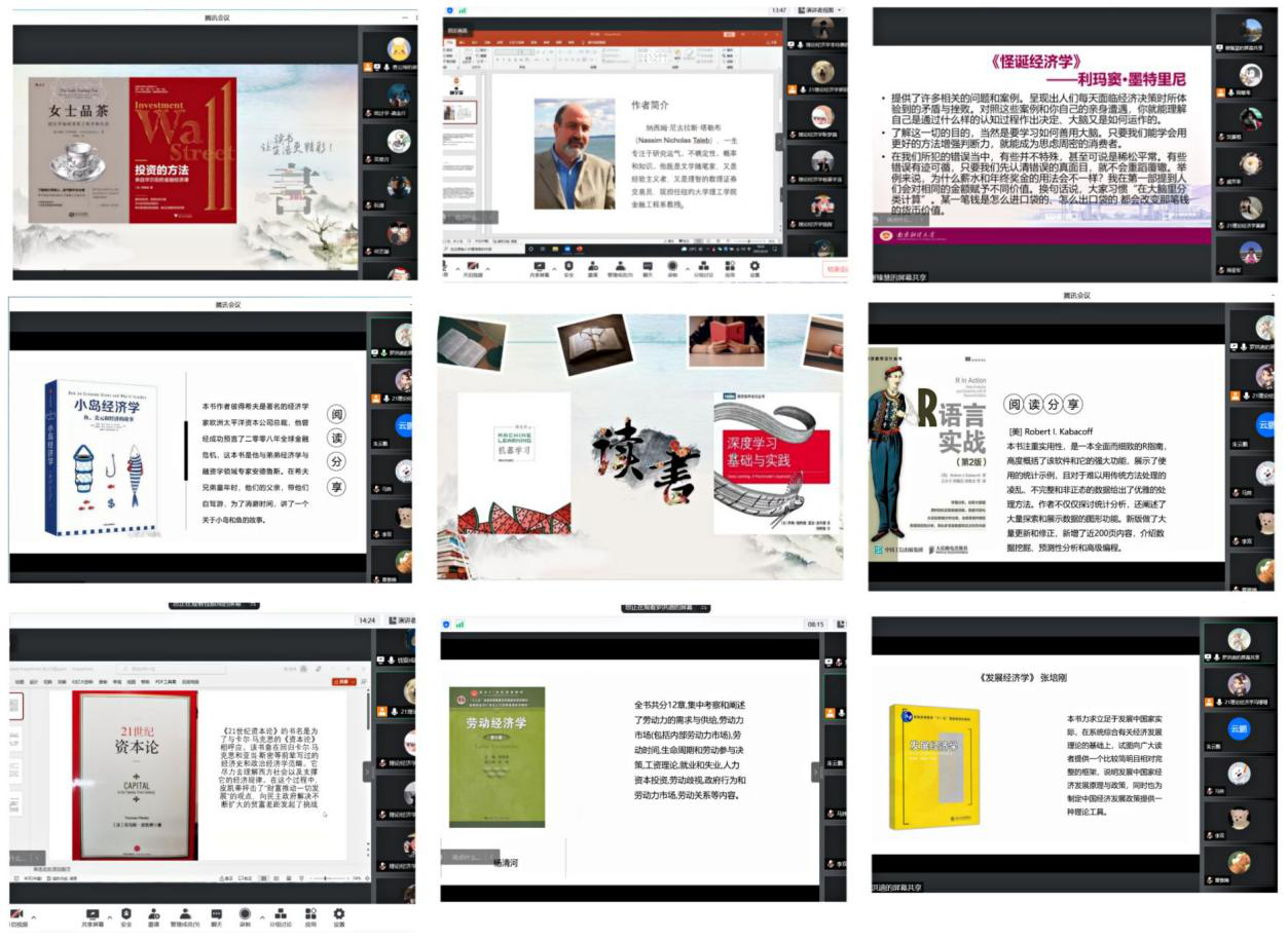 活动中,同学们在导师的建议和指导下纷纷选择学科的经典书目进行阅读。其中,既有《资本论》、《小岛经济学》这样的经典著作,也有《机器学习》、《R语言》这样的技能书籍,也不乏有同学选择《伟大的开端》、《火种》等红色书籍的进行阅读和体悟。在完成阅读后,同学们就各自对阅读的心得体会在专业内部进行分享。此次读书分享会,使同学们深刻体会到了经典书目的魅力,也让同学们对所学的专业有了更深层次的理解与认识,在阅读中丰富了自己的理论知识体系。
