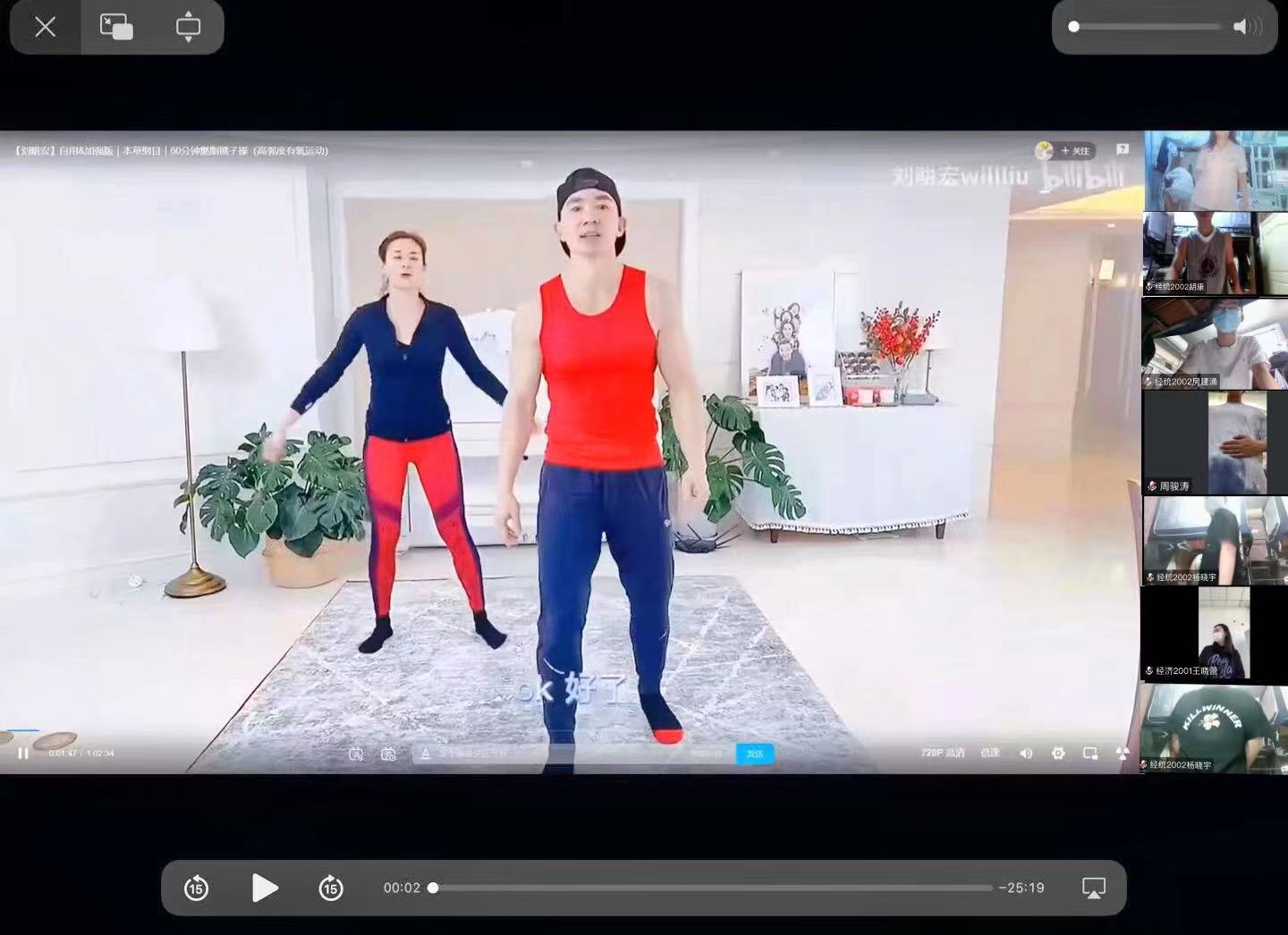 此次活动采取线上跟跳近期爆火的刘畊宏减肥操的形式开展。活动伊始,由主持人简要介绍了此次活动的整体流程,并提醒大家在运动过程中注意安全,根据自身的情况适度跟跳。随后活动开始,同学们纷纷打开了摄像头踊跃参与其中,有些同学还带动了同寝室的舍友一起参与其中,将欢乐的氛围充斥着整个房间。彼时,线上会议室中同学们活力四射的身影,让原本冰冷的会议室变得热火朝天起来。在跟跳完一套运动后,同学们迎来了中场休息时间。为拓展同学们的运动健身常识,主持人与同学们进行了问答互动,问题涉及运动、健身及饮食习惯等,最后抢答成功并且回答正确的同学将会收到特定的小礼物。休息结束后,又迎来了新一轮的跟跳环节,同学们在新一轮的运动中仍然保持昂扬的状态,活力充沛地参与其中,并将自己的运动视频发送给相应的工作人员完成打卡。活动的最后,主持人向同学们分享了有关运动健身的一些常识以及对于此次同学们的参与表示感谢。