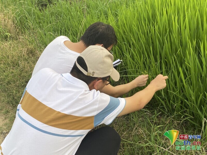 学子在盱眙黄花塘镇芦沟社区稻田中观察水稻