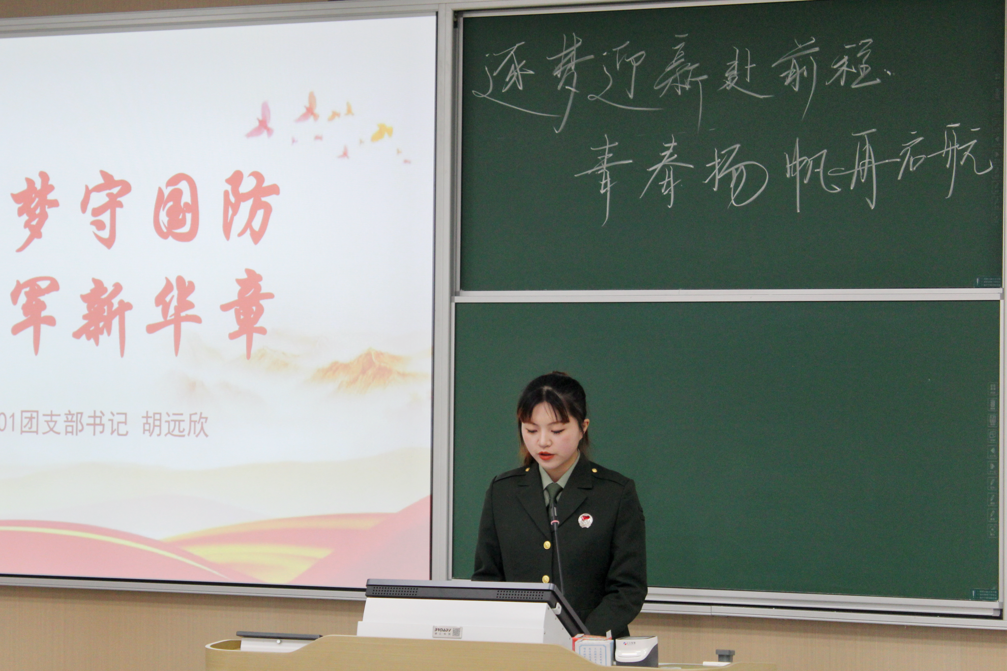 接着,经统2201胡远欣同学为新生们带来了一场生动的主题团课。值人民英雄纪念碑揭幕66 周年、中国人民解放军建军 97 周年,胡远欣同学深入阐释了习近平强军思想,并以此为引领,带领新生们共同纪念缅怀革命先烈。她深情讲述了烈士陈祥榕的英勇事迹,鼓励新生们关心国防建设,以强国强军为己任,学习军人本色,始终保持士兵冲锋的昂扬姿态。