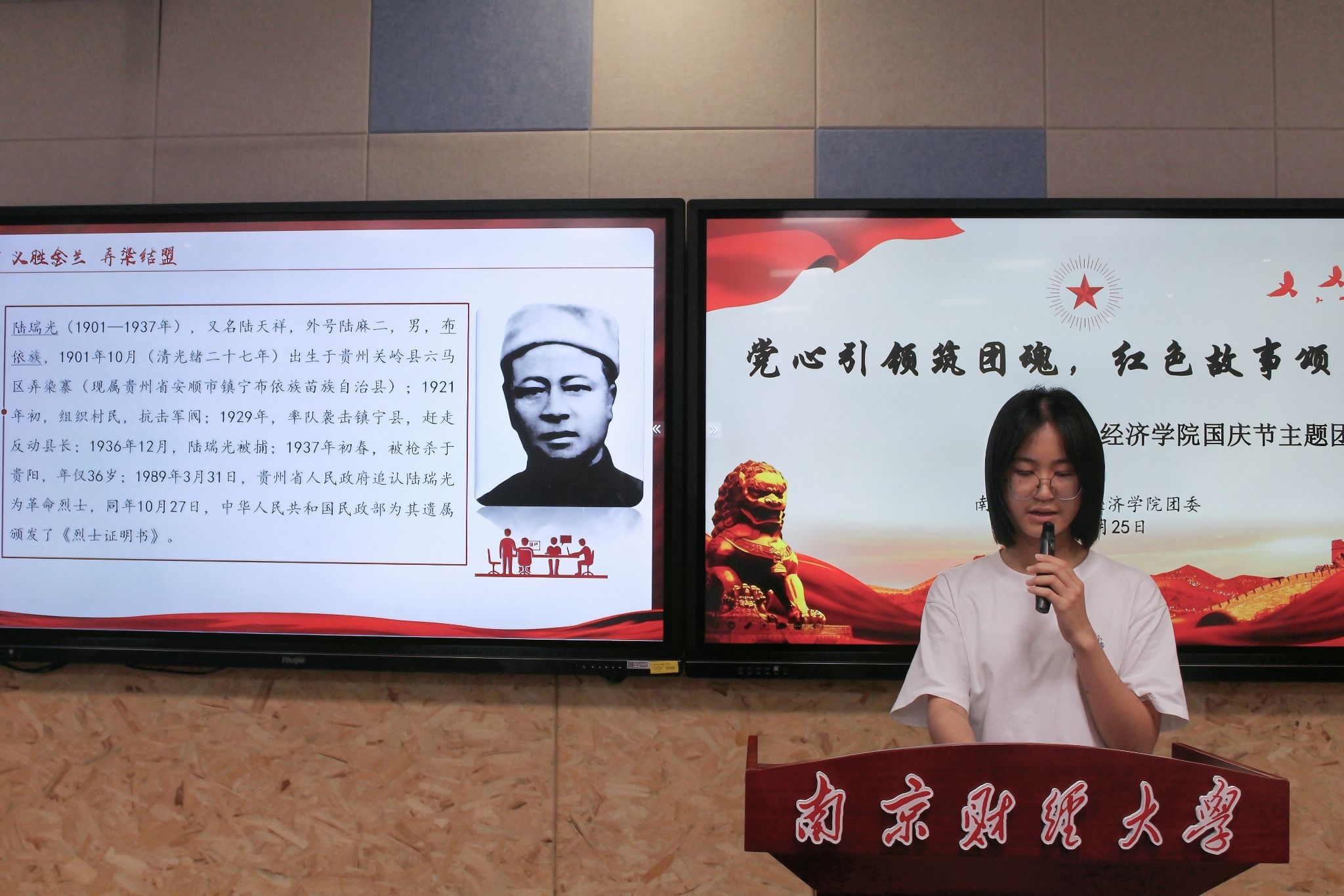 少数民族学生代表欧扬曦同学讲述了布依族烈士陆瑞光的事迹。在红军长征经过安顺少数民族地区期间,陆瑞光作为当地首领,与彭德怀、杨尚昆签订了反蒋作战协议,在少数民族地区播下了革命火种,是我党成功实现统一战线政策的光辉典范。
