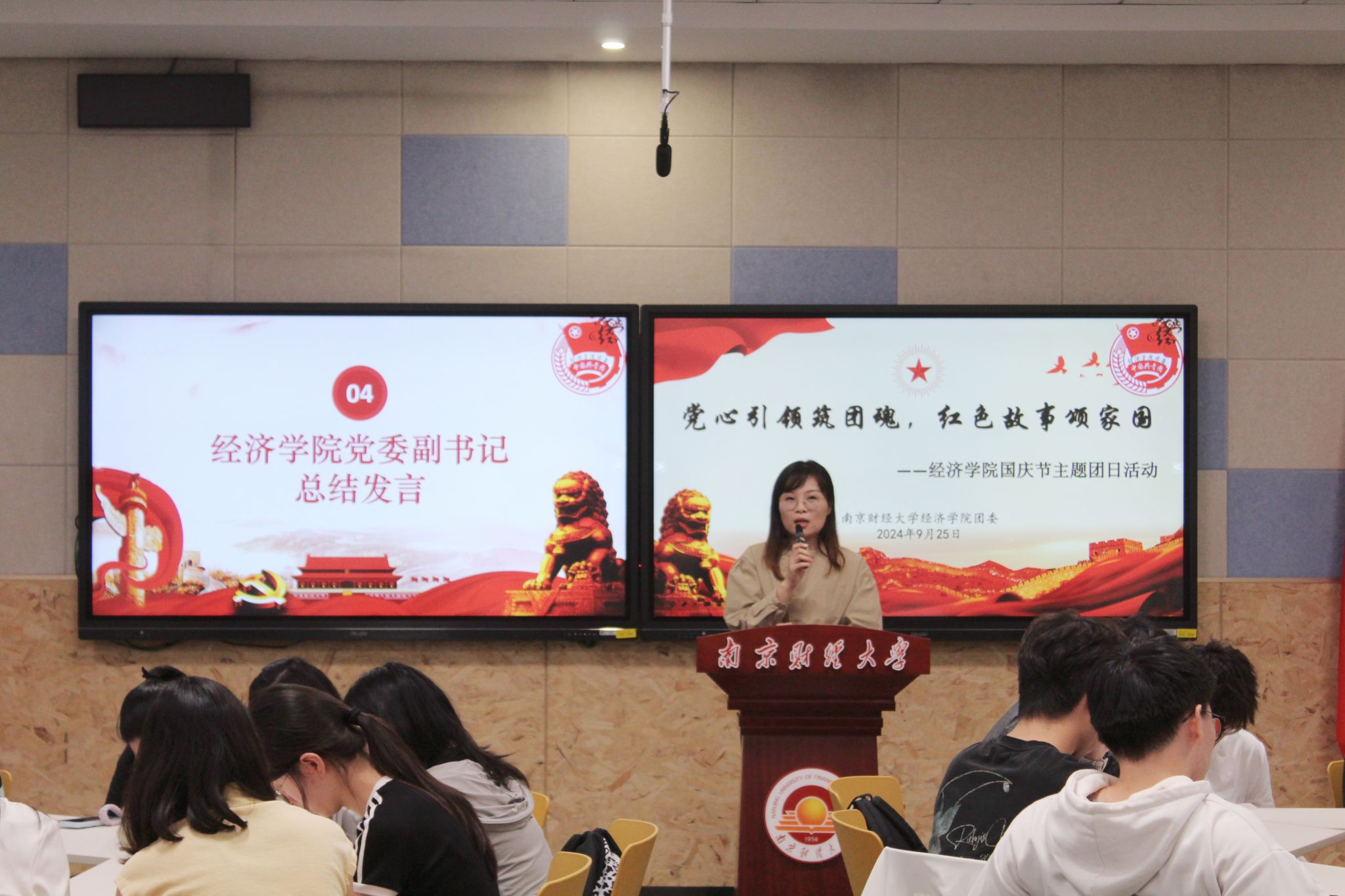党委副书记贾亦璞老师作总结发言。贾老师指出,共青团员应当始终与党同心、跟党奋斗,讲好红色故事能够引领他们深情回忆党的发展历程,回望家事国事。尤其是少数民族同学代表的精彩讲述,充分彰显了各民族同学在党旗下紧密团结,在相互依存、相互尊重的和谐氛围中茁壮成长,进一步增强了对中华民族的认同感、归属感、自豪感。她殷切鼓励团员们勇敢挑起自身的担子,明确自身的责任,在今后的学习、生活和工作中充分发挥先锋模范作用。从红色故事中汲取源源不断的力量,各民族同学携手并肩,共同奏响奋进的激昂乐章,为实现中华民族伟大复兴的中国梦贡献青春智慧与力量。