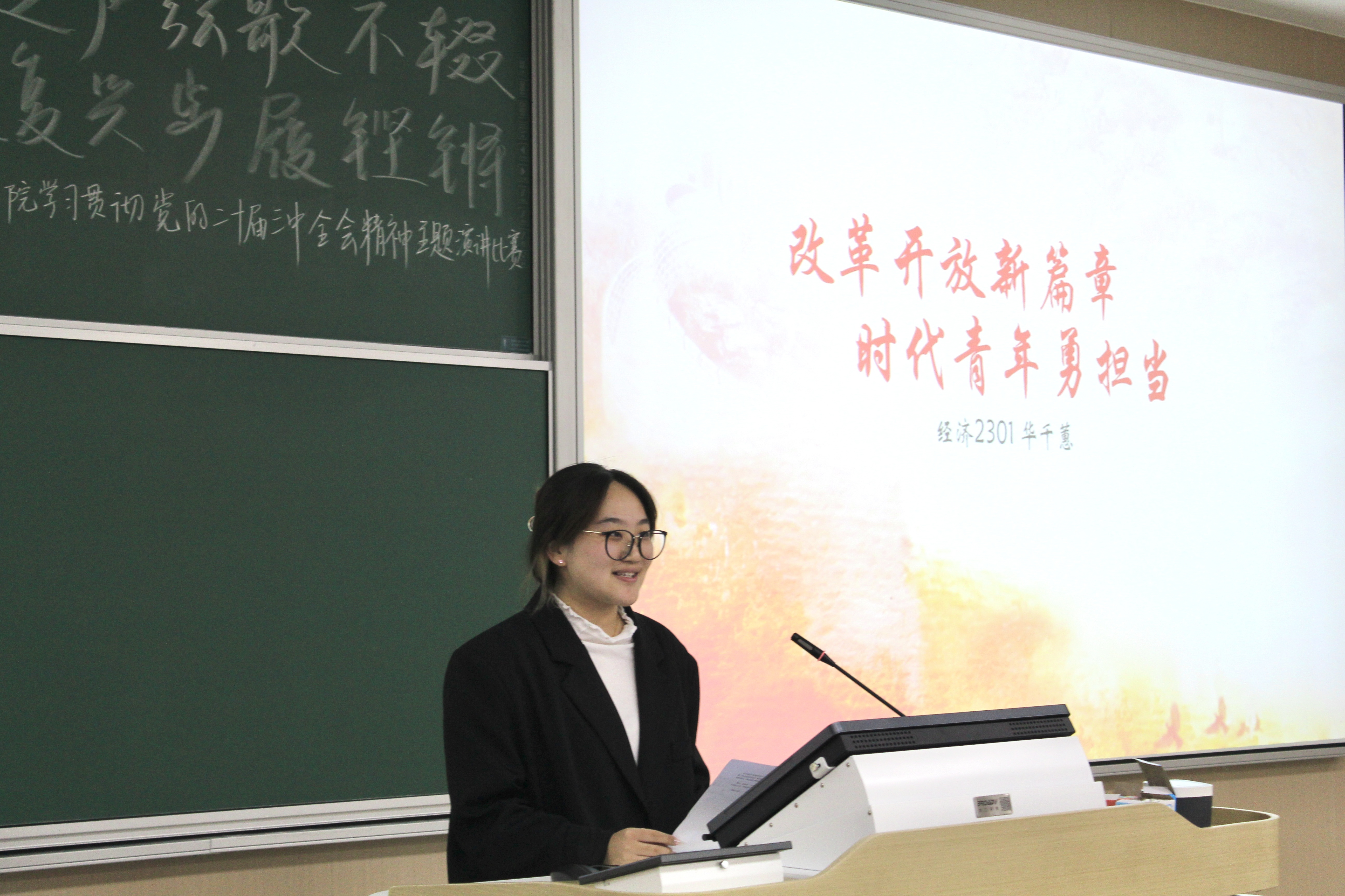 在比赛进行中,选手们立足自身,结合对党的二十届三中全会精神的理解,畅谈学习感悟,交流精彩解读,表达对全面深化改革的澎湃激情。丁晓卉选手回顾改革开放的历史进程,强调了青年学生在改革开放新篇章中所肩负的责任使命。华千蕙选手阐述了党的二十届三中全会的重大意义,深入分析了中国在改革开放和社会主义现代化建设中的成就与挑战,有力地论证了进一步深化改革的必要性。选手们的精彩演讲,既生动展现了新时期青年大学生良好的精神风貌,又充分展示了前一段时间学习的良好成效,进一步激发了经院学子深入学习贯彻党的二十届三中全会精神、奋力谱写现代化建设新篇章的昂扬斗志。
