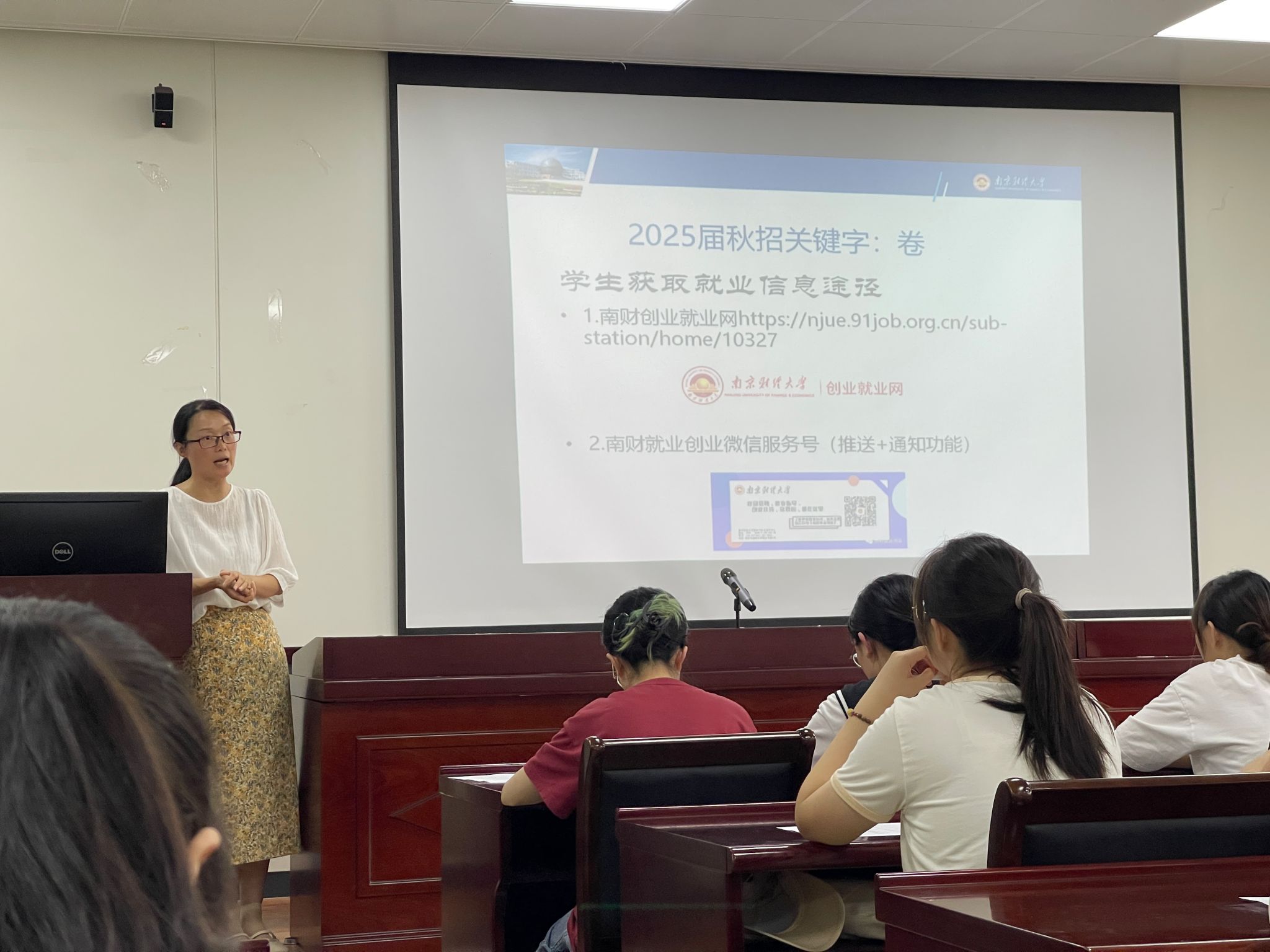 还邀请了2024届毕业班辅导员张闻老师对2025届毕业生的就业工作进行了指导。张老师详细分析了2024届毕业生的就业去向与质量,解读了2024届毕业生就业工作实施方案,提出了针对2025届毕业生的就业工作推进计划建议,强调了各时间节点的重要性。