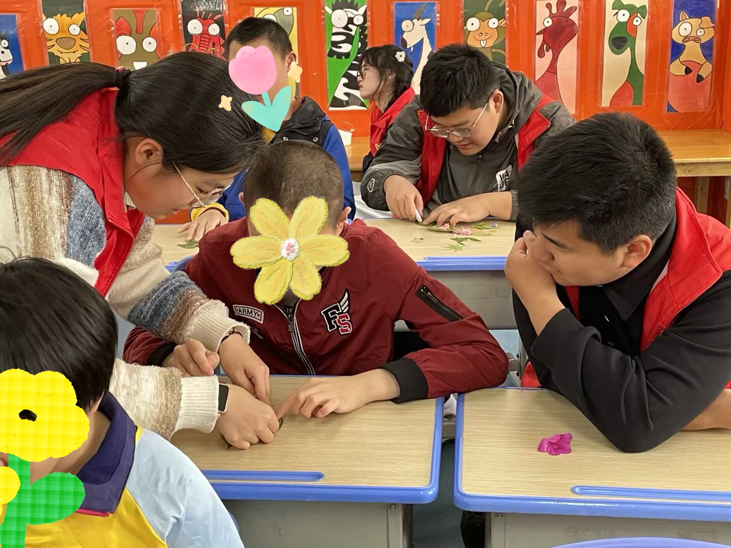 材料收集完毕,制作环节正式开启。志愿者和小朋友们两两一组,配合默契。小朋友们负责固定纸张和树叶,志愿者们则负责裁剪以及完善作品的细枝末节。在互动交流中,志愿者们注意到,尽管这些孩子们在表达能力等方面存在挑战,但他们对美的感知和对生活的热情却丝毫未减。