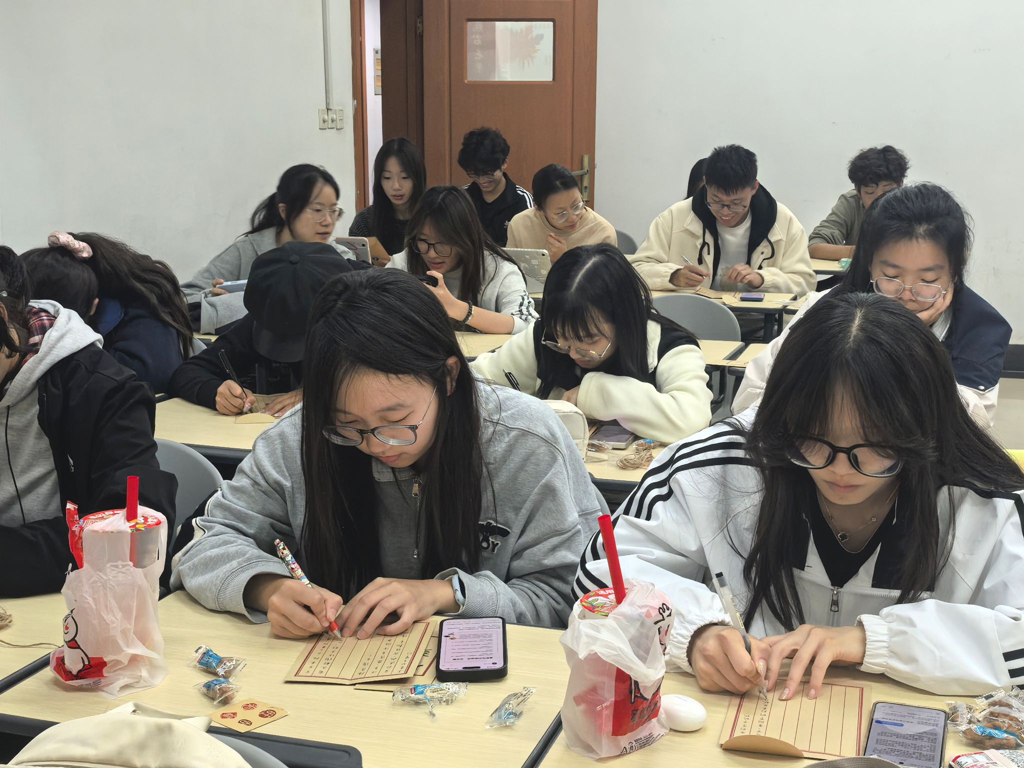 接下来,活动还特别设置了“纸短情长”与“贺卡寄情”环节,同学们现场给家中的长辈撰写了深情的家书,信中的一字一笔尽显对长辈的感恩与思念;同时,大家亲手制作贺卡,向退休教师送上最诚挚的祝福。这个环节彰显了中华民族爱老敬老的传统美德,让大家对重阳节的文化内涵有了更深的理解。