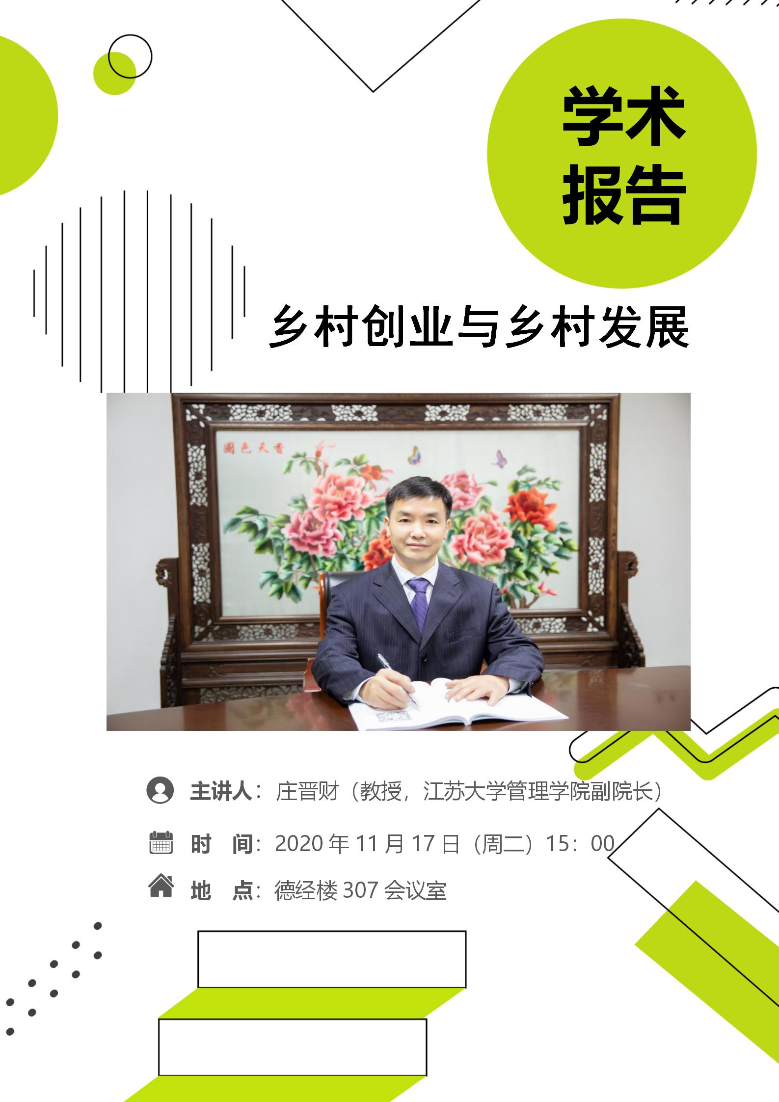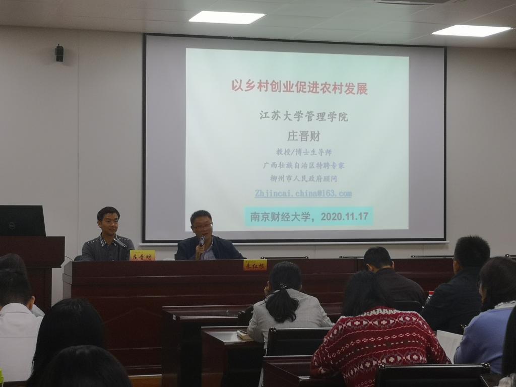 副院长庄晋财教授在仙林校区德经楼307会议室做题为《以乡村创业促进农村发展》的报告,西瓜直播足球
