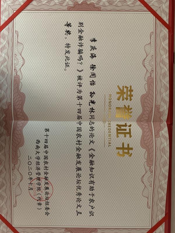 李庆海副教授受会议组织方邀请,就数字普惠金融的专题论文汇报进行了点评。徐闻怡同学在论坛汇报了《金融知识有助于农村居民识别金融诈骗吗?》一文。文中指出金融知识有助于农户识别金融诈骗,社会互动、适度的信息关注和主观幸福感更有助于金融知识作用的发挥,在不同类型金融诈骗的作用中,金融知识对识别的影响在电信诈骗、网络诈骗和传统诈骗中显著。该文引起了与会者的普遍关注和重视,并最终从近百篇论文中脱颖而出,获得优秀论文三等奖。