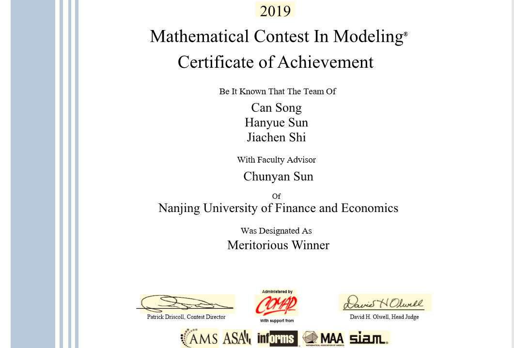 学子参加2019年美国大学生数学建模竞赛获奖名单