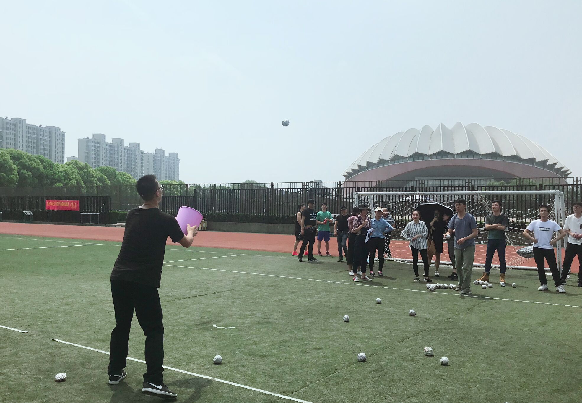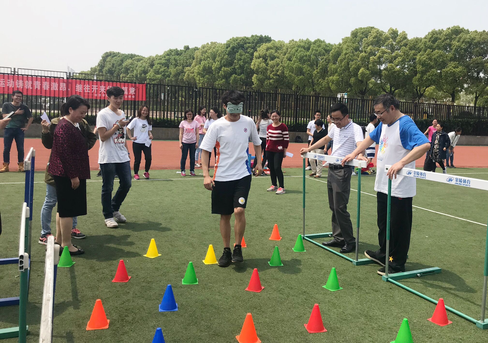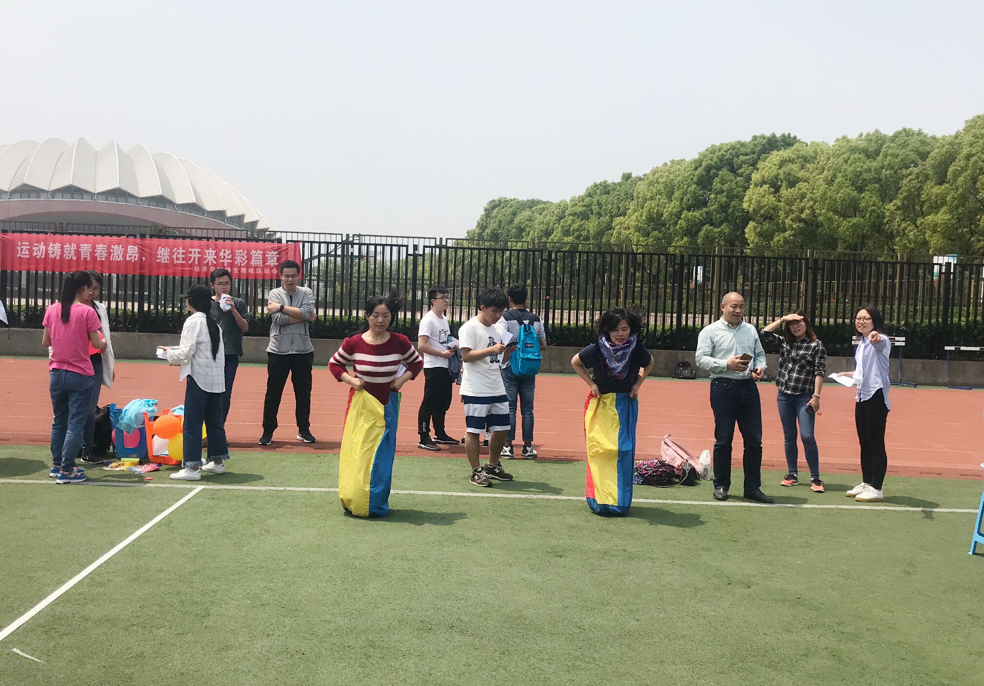 “砥砺前行”比赛中,师生组抓稳节奏,从容不迫,在一分钟内一人用筷子将第一个碗里的乒乓球夹到第二个碗里,另一人用吸管将第二个碗里的乒乓球吸到第三个碗。“跨越入世”比赛中,师生穿上麻袋双腿并拢,奋力向前跳跃,交替完成来回的袋鼠跳。“南方的春天”中,教师和学生穿上西瓜直播足球