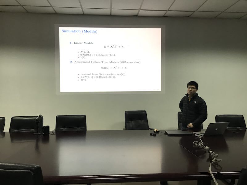 史兴杰教授以他的工作论文《高维非凸损失函数的分段前进后退算法》展开报告,详细介绍了分段前进后退算法以及它在高维非凸损失函数下的收敛性。通过模拟计算和实例分析,证明了该算法在处理高维统计模型以及进行非凸高维秩估计时具有良好的统计性质,同时具有降低计算难度、加快计算速度的优势。
