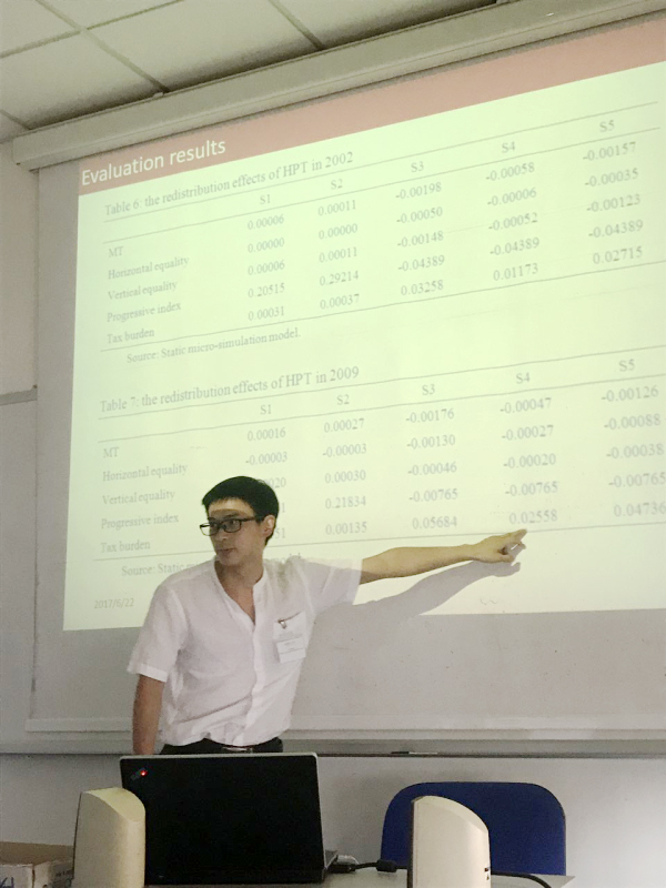 Micro-Simulation》入选本届年会,并在大会上进行了汇报。该论文采用中国城镇地区住户调查数据和静态微观模拟模型,研究了中国居民房产税的收入分配效果,评估了119种可能税制。根据研究发现,中国重庆和上海房产税力度较为微弱,但能够发挥积极收入再分配效果;为达到最优的收入再分配效果,合理的房产税应考虑合适的累进税率结构,或者合理选择免征规则和税率结构。与会专家对相关问题进行了讨论。