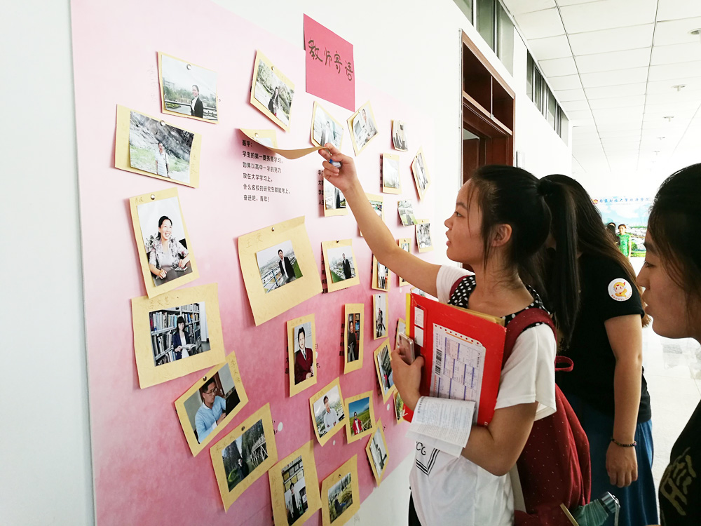 通过系统数据挑选出了十多名“特殊”的同学:“离家最远”的新生、“年龄最小”的新生、“最学霸”新生等,并为他们准备了精美的礼物。教师寄语墙上贴满了老师们的照片,新生们翻阅照片就可以看到老师对他们的寄语:“再难也要坚持,再差也要自信,美丽人生从今天开始。”“希望同学们从今天开始,独立自主,自我管理,开启新的生活。”……这些寄语表达了老师对同学们的殷切的期盼和美好祝福。