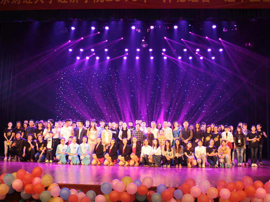 特聘外教老师Jeffery Smith自弹自唱起自创的歌曲《Doctor Night Shades》,洪亮独特的嗓音丝毫不逊专业歌手,博得现场观众连连鼓掌叫好。古典舞《梨花瘦》由大四毕业生费越同学自编自排自演,舞蹈柔中带刚,仙气十足,令人沉醉。歌曲《默》也是由大四毕业生倾情演唱,唱出了大学四年对青春的执着。王庚老师一首《我的中国心》将晚会推向高潮,王老师与同学们一起高歌祖国,还寄语毕业生们要有一颗永远情系母校的赤子心。随后播放了精心拍摄的视频,即将毕业的大四同学们出现在视频中,公开说出了想说的话,共同回忆了有趣的故事。毕业班辅导员尹海燕与副院长陈耀辉(主持工作)也出现在视频中,给毕业生送上了最诚挚的祝福。台下,有人开始小声的啜泣,郝园园老师携着尹海燕老师五岁的女儿出现在舞台中央,合唱一首《手牵手》,稚嫩清澈的嗓音将全场气氛再次推向高潮,“我们将要面对未来的分离,请你牢记这段记忆,朋友我永远祝福你,人生一定有起落,但请不要伤心,我会在你身边,把我们的心放在一起,共同度过风和雨”……最后,晚会在合唱《仰望天空》中缓缓落下帷幕。