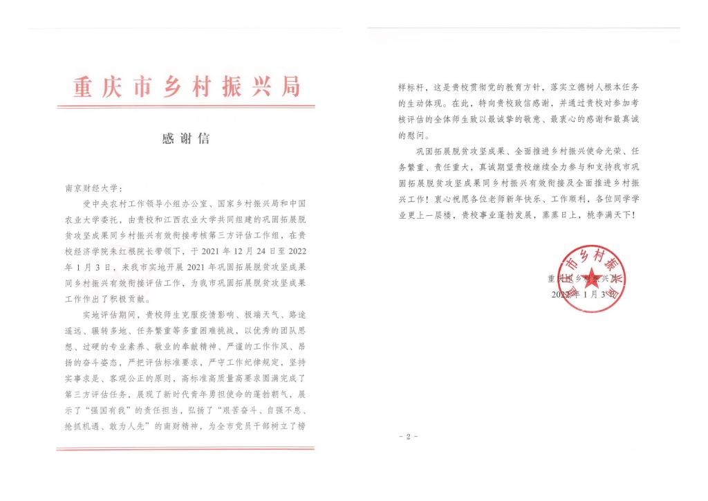 通力配合,确保评估工作顺利完成。评估期间,朱红根教授作为第三方评估组组长,带领团队克服疫情、极端天气等多重困难挑战,完成了4县抽查工作,调查涉及57个乡镇、79个行政村,开展座谈访谈187次,共计访谈324人,入户调查1645户农户。评估过程中严把评估标准要求、严守工作纪律规定,坚持实事求是、客观公正的原则,高标准高质量高要求圆满完成了第三方评估工作。评估工作得到了重庆市委、市政府的高度赞扬,并委托重庆市乡村振兴局专门给学校发来感谢信。