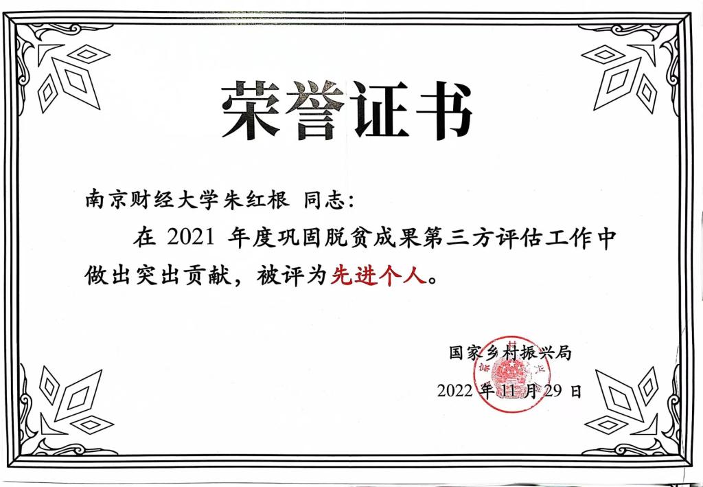 会上表彰了一批在2021年度巩固脱贫成果第三方评估工作中做出突出贡献的先进集体和先进个人。朱红根教授团队被授予“先进集体”荣誉和“先进个人”称号。