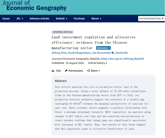 赵爱栋博士与荷兰阿姆斯特丹自由大学等学者的合作论文“Land investment regulation and allocative efficiency: Evidence from the Chinese manufacturing sector”被城市与区城经济学国际顶级期刊Journal of Economic Geography正式接受发表。南京财经大学西瓜直播足球