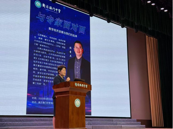 张圣兵书记一行随即来到新沂海门中学进行交流,双方各自介绍了学校的办学情况并就相关合作达成一致。5月10日上午,张圣兵书记应邀开设了题为“数字经济发展与我们的选择”的讲座,新沂海门中学校长王美华,副校长徐峰以及全体高二学生和家长参加了此次讲座。张圣兵书记向同学们介绍了不同职业的特点、发展前景以及所需的能力素质。从新兴的人工智能、大数据行业,到传统但不断创新的医疗、教育行业,丰富的职业信息让同学们大开眼界。讲座结束后,同学们纷纷表示收获满满,对自己的未来也有了更多的思考和规划。