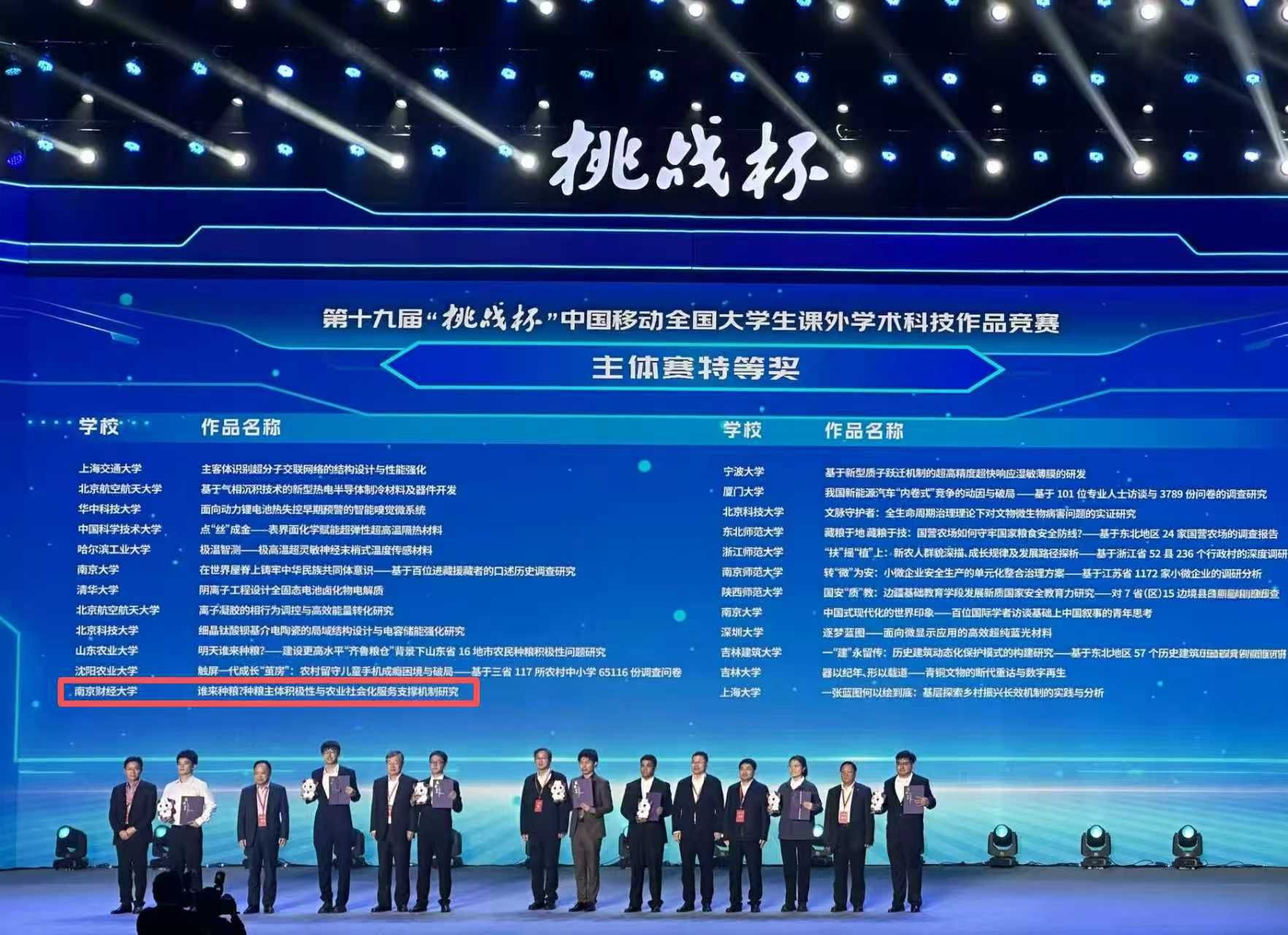 继在第十八届“挑战杯”中获特等奖后,再次在“挑战杯”主体赛中斩获特等奖,也是全国唯一连续两届在主体赛中斩获特等奖的财经院校。