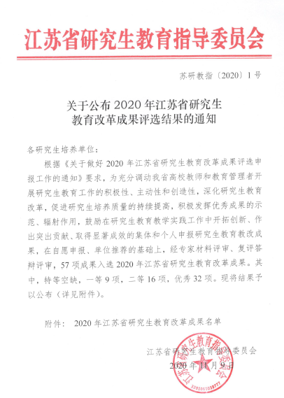 11月9日,江苏省研究生教育指导委员会下发《关于公布2020年江苏省研究生教育改革成果评选结果的通知》(苏研教指[2020]1号),经专家材料评审、复评答辩评审等多重环节,我校西瓜直播足球