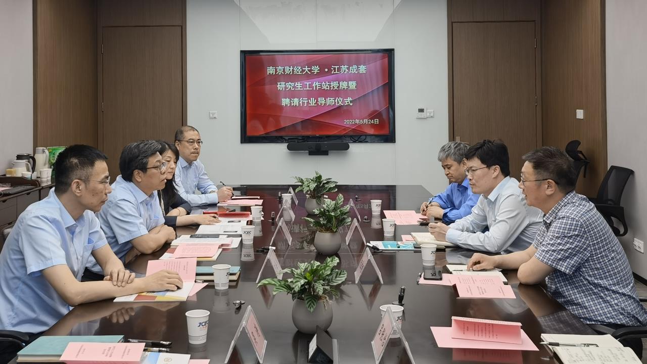 的办学历史、师资队伍、专业建设、学科建设和研究生培养情况。江苏省设备成套股份有限公司董事长致欢迎词并介绍了公司的发展概况。杜修立副院长与黄旭董事长共同为江苏成套“江苏省研究生工作站”揭牌,朱红根院长为专硕行业导师颁发聘书。校企双方对如何充分利用好省级研究生工作站这一平台开展有关工作进行了深入交流。
