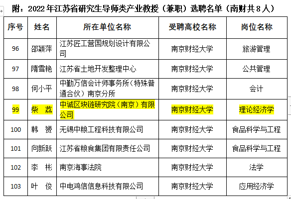 新增1个江苏省产业教授,即:中诚区块链研究院(南京)有限公司的柴荔。