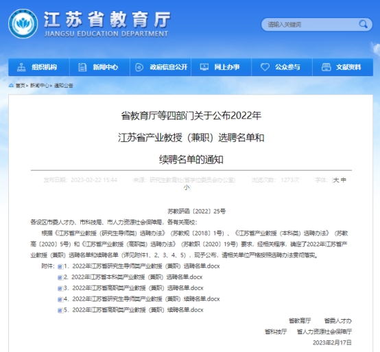 日前,江苏教育厅、省委人才办、省科技厅、省人力资源社会保障厅印发《省教育厅等四部门关于公布2022年江苏省产业教授(兼职)选聘名单和续聘名单的通知》(苏教研函〔2022〕25号),西瓜直播apk