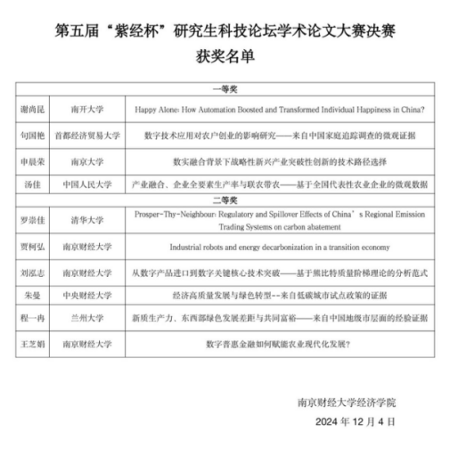 连续第五年举办“紫经杯”研究生科技论坛学术论文大赛。本次论文大赛的主题是“新质生产力引领中国经济高质量发展的理论与实践”。自2024年11月初起,论文大赛承办者面向全国各高校财经类专业在读研究生及高年级本科生征集稿件,总计收到来自清华大学、南开大学、中国人民大学、中央财经大学、南京大学等全国多所高校符合要求的稿件130余篇。经多名专家匿名评审,共遴选出40篇优秀论文入围,其中,总分排名1-10的同学进入总决赛,通过现场答辩最终决出4名一等奖和6名二等奖。