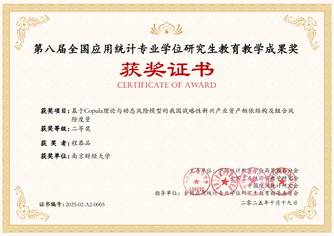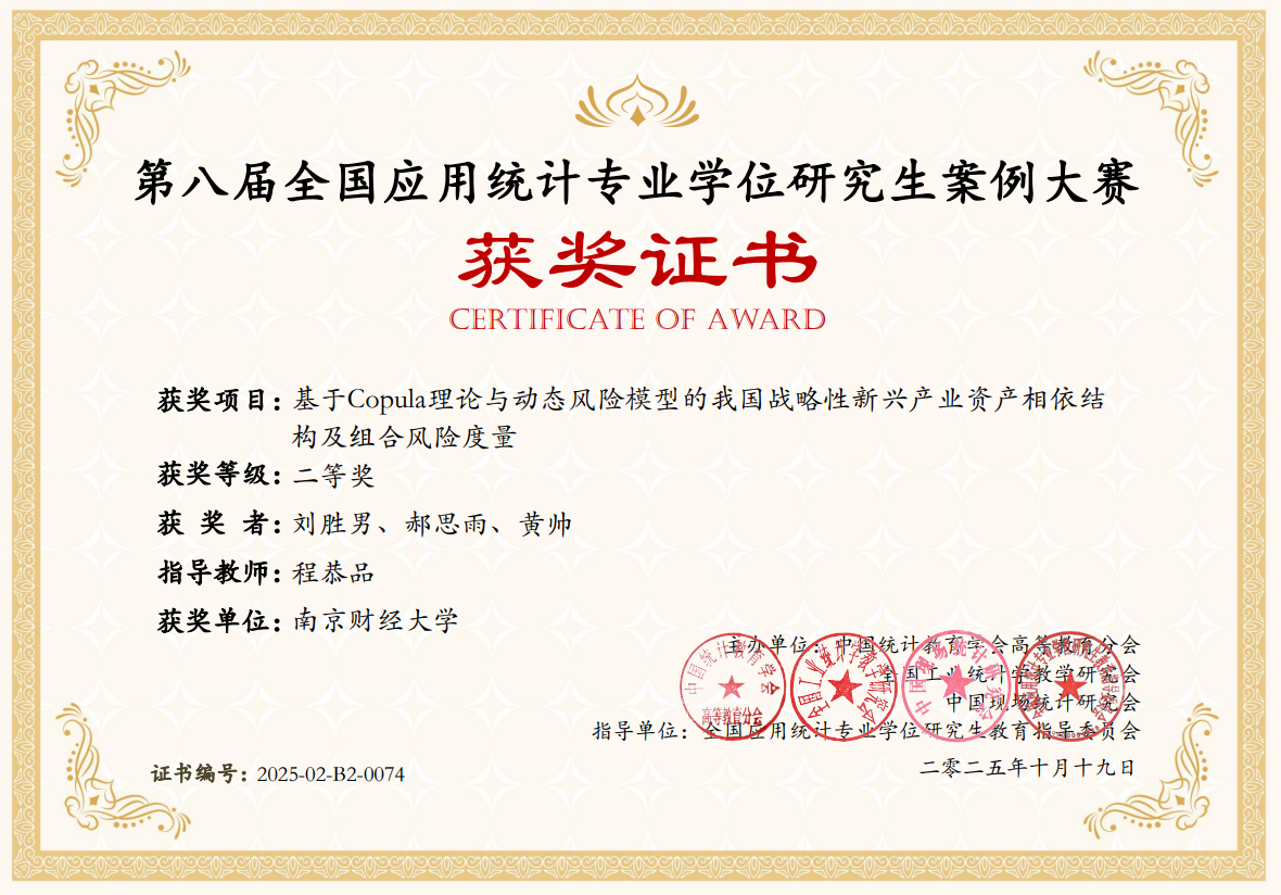 1.获奖项目:基于Copula理论与动态风险模型的我国战略性新兴产业资产相依结构及组合风险度量;获奖等级:二等奖;获奖者:刘胜男、郝思雨、黄帅;指导教师:程恭品