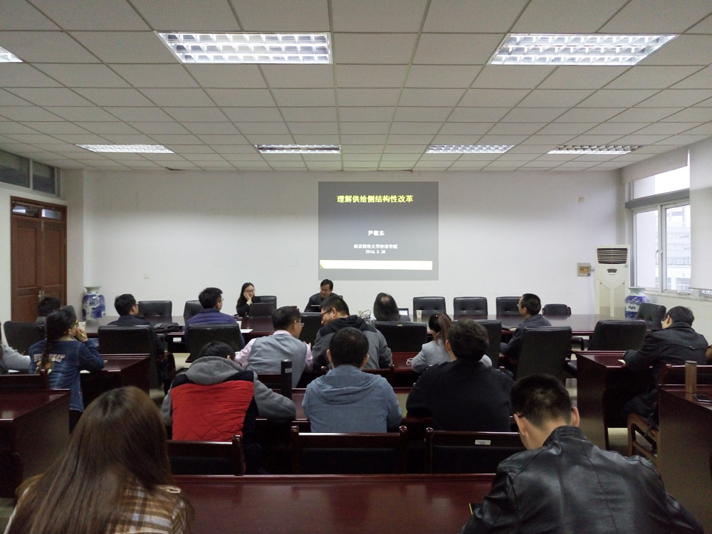 尹敬东教授首先解读了供给侧结构性改革的内涵,结合我国历次中央经济工作会议诠释了我国需求侧宏观经济需求管理模式的特征和式微的原因,认为当前中国依靠投资、出口等需求侧的改革已无法有效解决当下中国经济增长面临的结构性问题,结构性问题催生了供给侧结构性改革。通过回顾近三十年来我国供给侧三次核心改革:八十年代的家庭联产承包责任制、国企改革和九十年代的社会主义市场经济体制改革,尹敬东教授提出他关于供给侧改革对策的思考,认为供给侧结构性改革最重要的是制度性改革,而制度变革的核心是“简政放权”减少管制,增强经济的双创能力。最后,尹敬东教授对目前中国经济的四大结构性问题进行了分析,并就去产能、去库存等问题提出了建议。尹敬东教授的报告让在场师生对当前中央经济政策有了更深入的理解,拓展了同学们思考宏观经济问题思维,拓宽了同学们看待问题的宏观视野。
