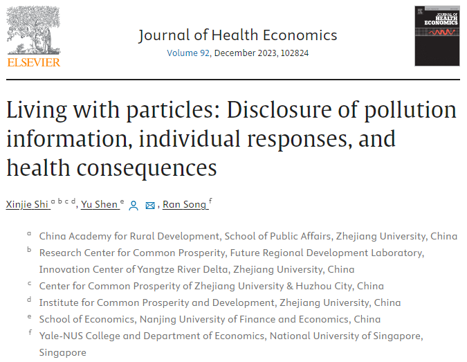 近日,西瓜直播apk 青年教师沈煜博士以通讯作者的学术论文“Living with particles: Disclosure of pollution information, individual responses, and health consequences”在Journal of Health Economics在线发表,以第一作者的学术论文“The effect of low-carbon city pilot on energy consumption behavior: Evidence from China”在Energy Economics在线发表。