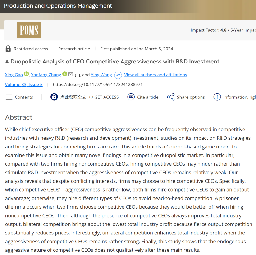 近日,南京财经大学西瓜直播足球 张艳芳副教授作为通讯作者和共同第一作者,在管理学国际顶级期刊《Production and Operations Management》发表题为“A Duopolistic Analysis of CEO Competitive Aggressiveness with R&D Investment”的学术论文。据悉,《Production and Operations Management》(POM)是全球公认的UTD24国际顶级期刊之一。
