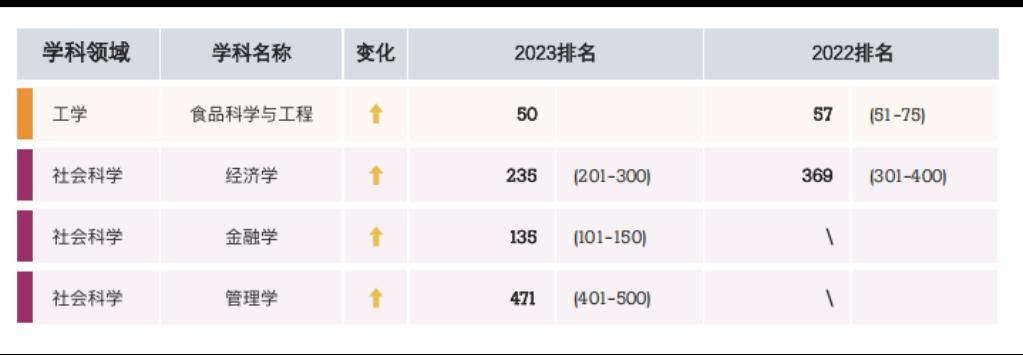 我校食品科学与工程排名全球第50位,金融学排名全球第135位,经济学排名全球第235位,管理学排名全球第471位。我校在2023“软科世界一流学科排名”的上榜学科数量和质量较2022年均有显著提升,金融学和管理学两个学科首次进入该榜单。